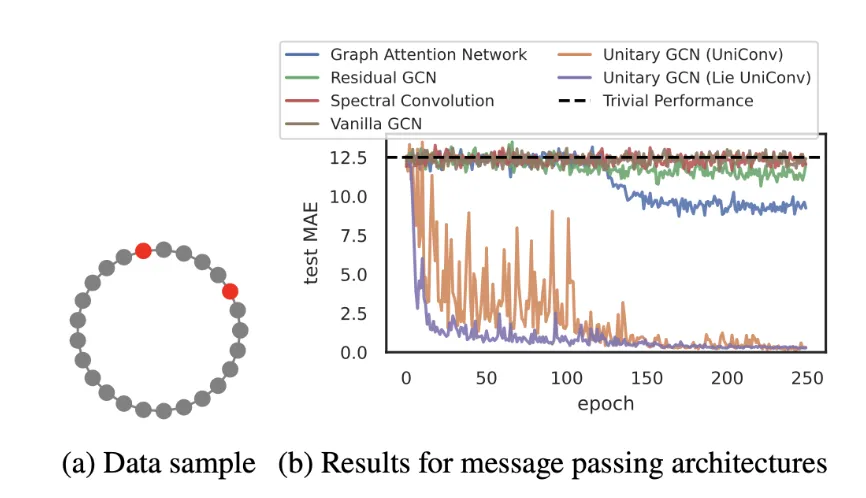 An example from the preprint illustrating how unitary GNNs outperform conventional message-passing networks in learning long-range dependencies. In this example, the task involves predicting the distance between two nodes in a ring graph of 100 nodes.