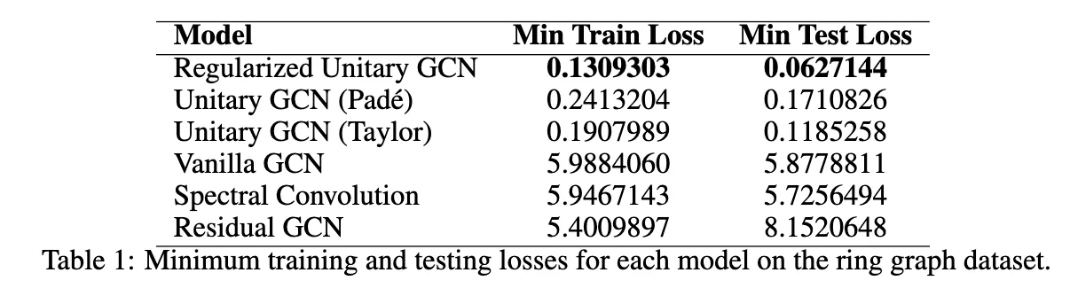 The experimental results from the original paper demonstrated the effectiveness of unitary convolutional networks in learning long-range dependencies using a toy dataset. This dataset consists of 1,000 ring graphs, each with 100 nodes. Each node has a one-dimensional feature vector, where all but two nodes are set to zero, and the two connected nodes are set to one. The task was to predict the distance between these two nodes on the ring graph. The unitary convolutional architectures succeeded where other models, such as graph attention networks and residual GCNs, struggled.