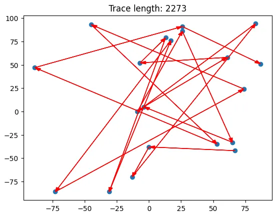 As with most prompt engineering concepts, I think that it’s easier to understand with an example than by reading the description. Let’s start with the one that I implemented. In this case, there is a set of 20 points on the xy-plane, and the model is tasked with finding the shortest path through the points such that every point is visited and no point is visited more than once. This is an example of the traveling salesman problem.