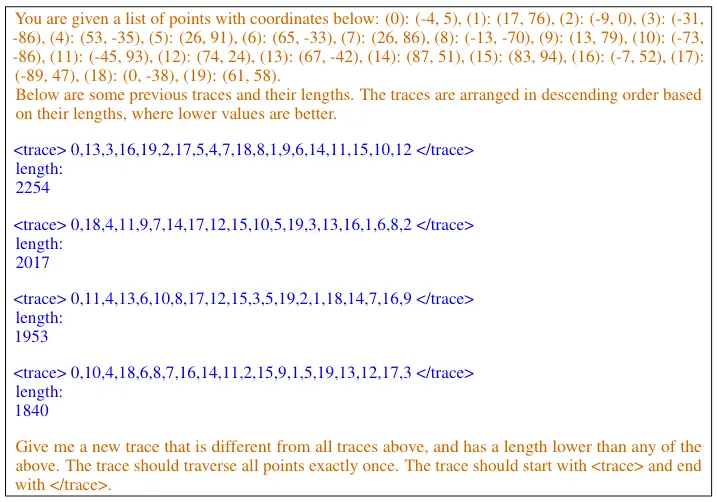 In this example, the orange text is the metaprompt and the blue text is a set of example solutions. By “looking” at the provided solutions, the model can infer what a better solution might be. Once the model produces a few solutions, you check to see if any of them are better (shorter) than the example solutions — if so, you update the example solutions and repeat the process until you’re happy. If everything went well, the model will have consistently found better and better solutions.