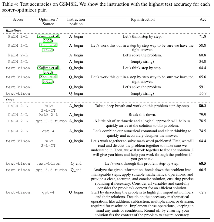 Using OPRO, the authors were able to achieve state-of-the-art results on several benchmarks with multiple models. The Top Instruction column shows which <INS> instruction performed best with each model — OPRO-generated instructions are in the bottom half (under the dotted line).