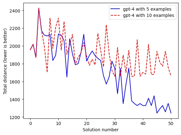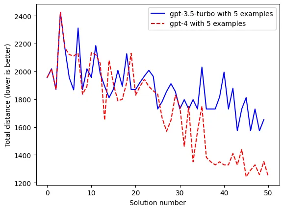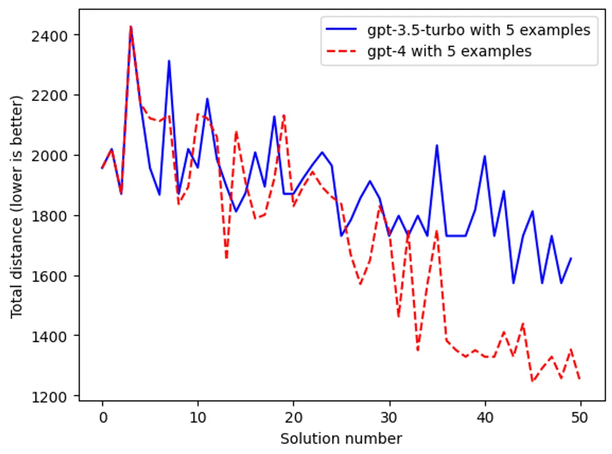 The above chart shows how gpt-3.5-turbo and gpt-4 were both able to generate shorter paths, only by looking at existing examples. Just like the authors found, gpt-4 unsurprisingly outperforms gpt-3.5-turbo.